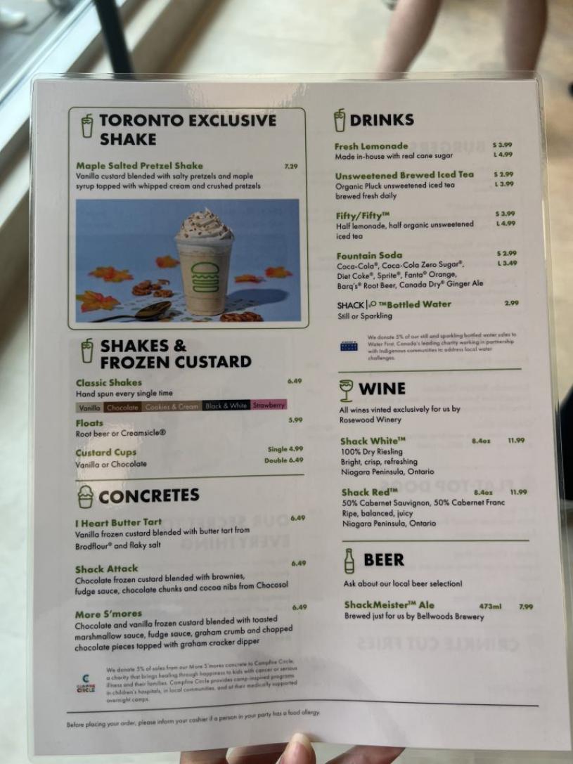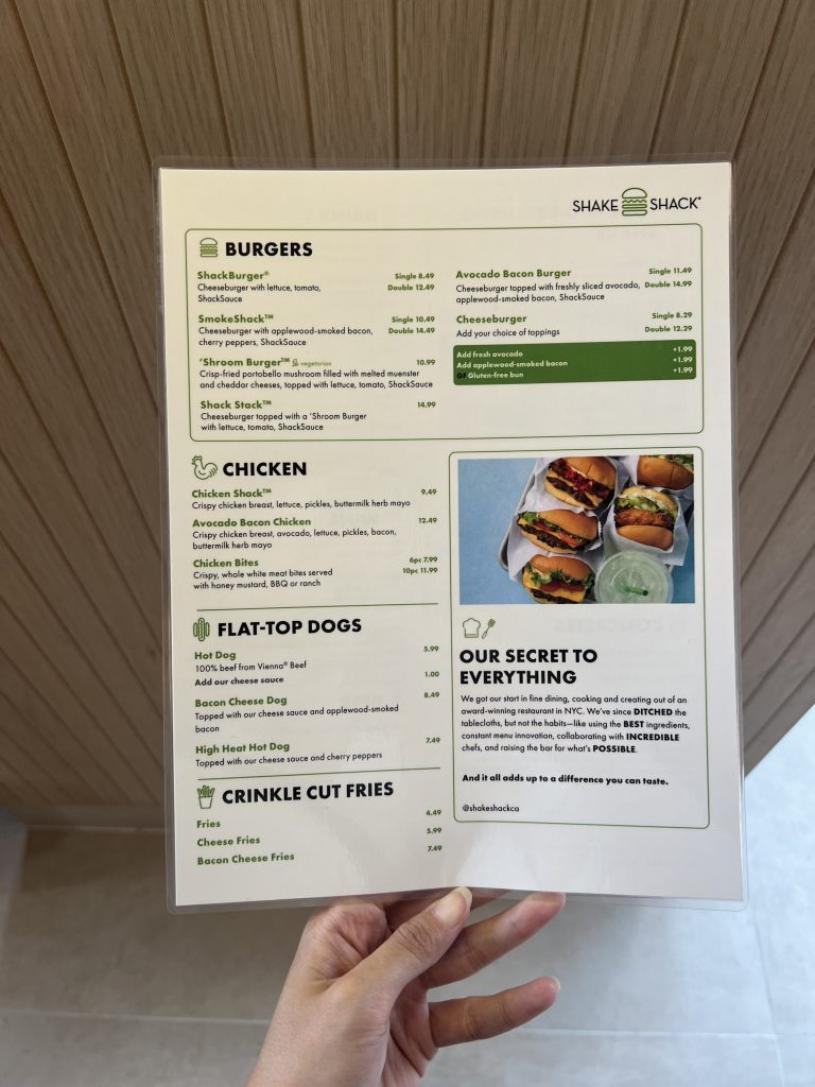 加拿大Shake Shack 餐單跟美國的大同小異,都有牛肉漢堡、雞肉漢堡、熱狗及薯條等。值得一提的是,加拿大Shake Shack的漢堡扒是100%採用加拿大安格斯牛。記者嚐了招牌單層 ShakeBurger($8.49),牛肉味濃,但偏乾身。