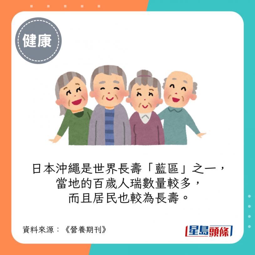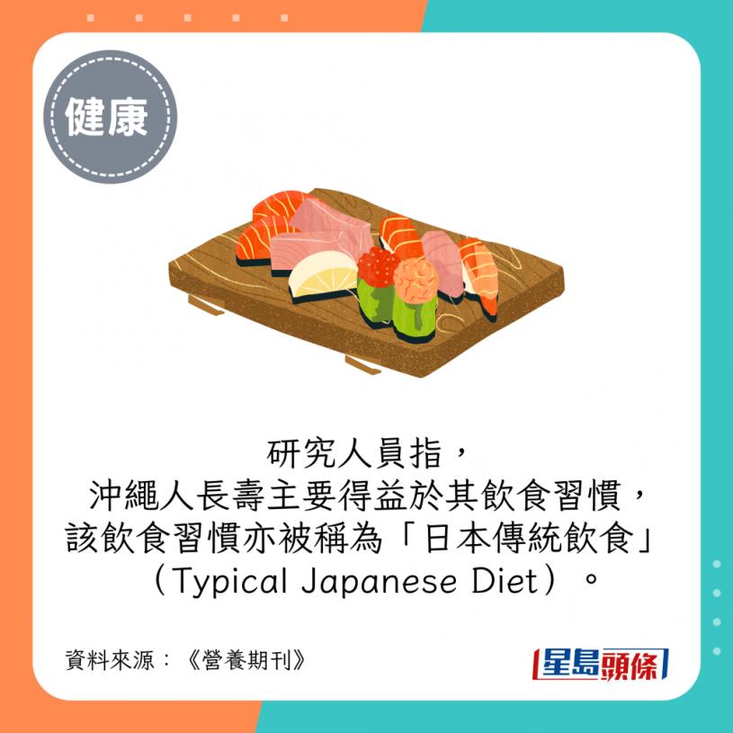 日本沖繩是世界長壽「藍區」之一,當地的百歲人瑞數量較多,而且居民也較為長壽。研究人員表示,沖繩人長壽主因得益於其飲食習慣,該種飲食習慣亦被稱為「日本傳統飲食」(Typical Japanese Diet)。