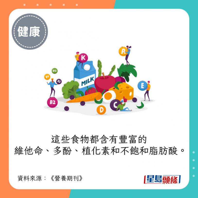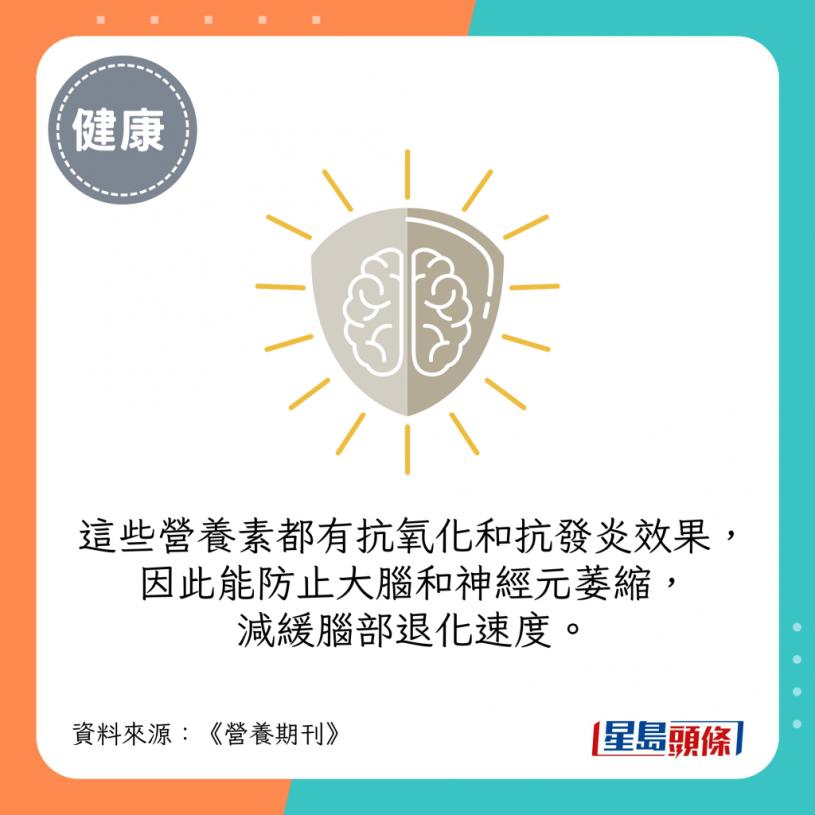 這些食物均含有豐富的維他命、多酚(polyphenol)、植化素(phytochemical)和不飽和脂肪酸,這些營養素都有抗氧化和抗發炎效果,因此能防止大腦和神經元萎縮,減緩腦部退化速度。