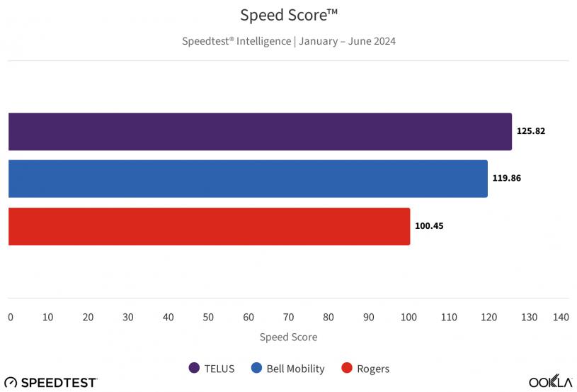 如果比较流动手机上网的表现,Telus就稍胜Bell,在 Speedtest 中得到125.82分,下载速度中位数为 137.37 Mbps,成为了速度最快的流动数据供应商。