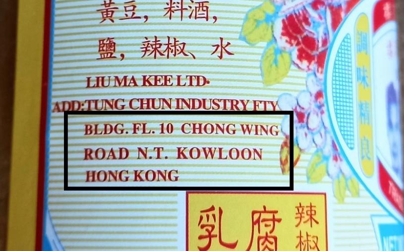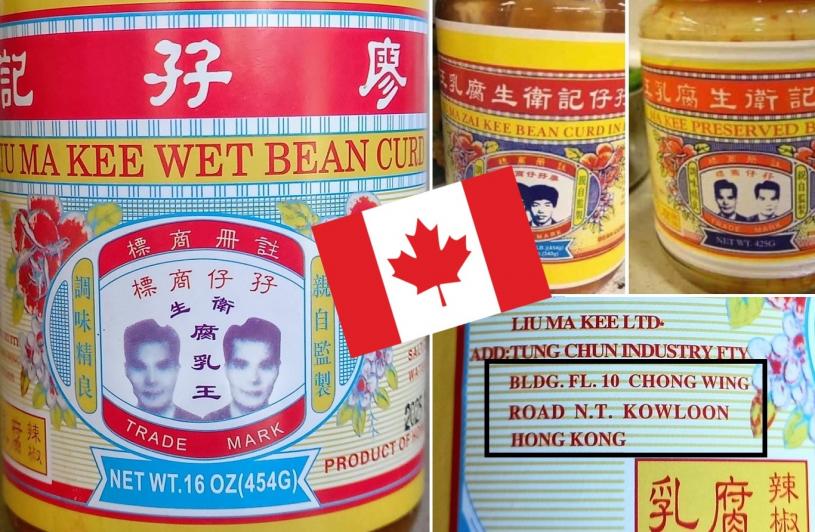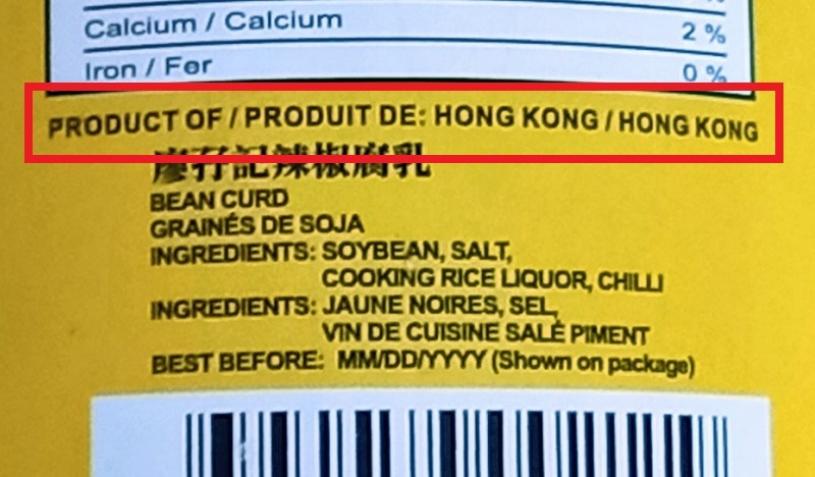 加拿大星岛记者从温哥华一家华人超市购得一瓶以红色胶盖玻璃樽包装的“廖孖记”辣椒腐乳,招纸上有英文标明“Product of Hong Kong”(香港产品),更特别的是瓶身另一面有超小字以英文和法文注明是香港出产,成份和品名同样有英、法双语,可见无论其真正产地是何处,该品的销售对象是加拿大消费者。