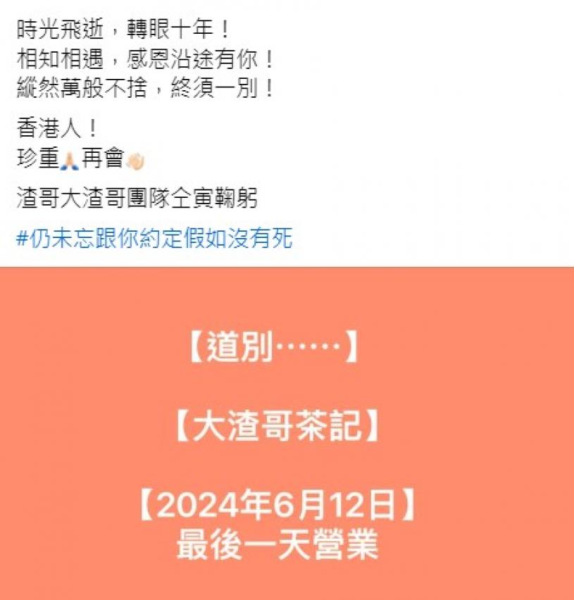 渣哥在结业告示中写道:“明日之后,告别香江!”、“信是有缘,后会有期”,还用上了王菲名曲《约定》的歌词“仍未忘跟你约定假如没有死”。