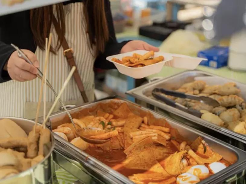 现场有卖韩式炸鸡和烤肉摊子,还有许多其他的街头小吃,比如炒年糕、血肠、韩式热狗等,甜品雪冰和奶茶也必不可少。