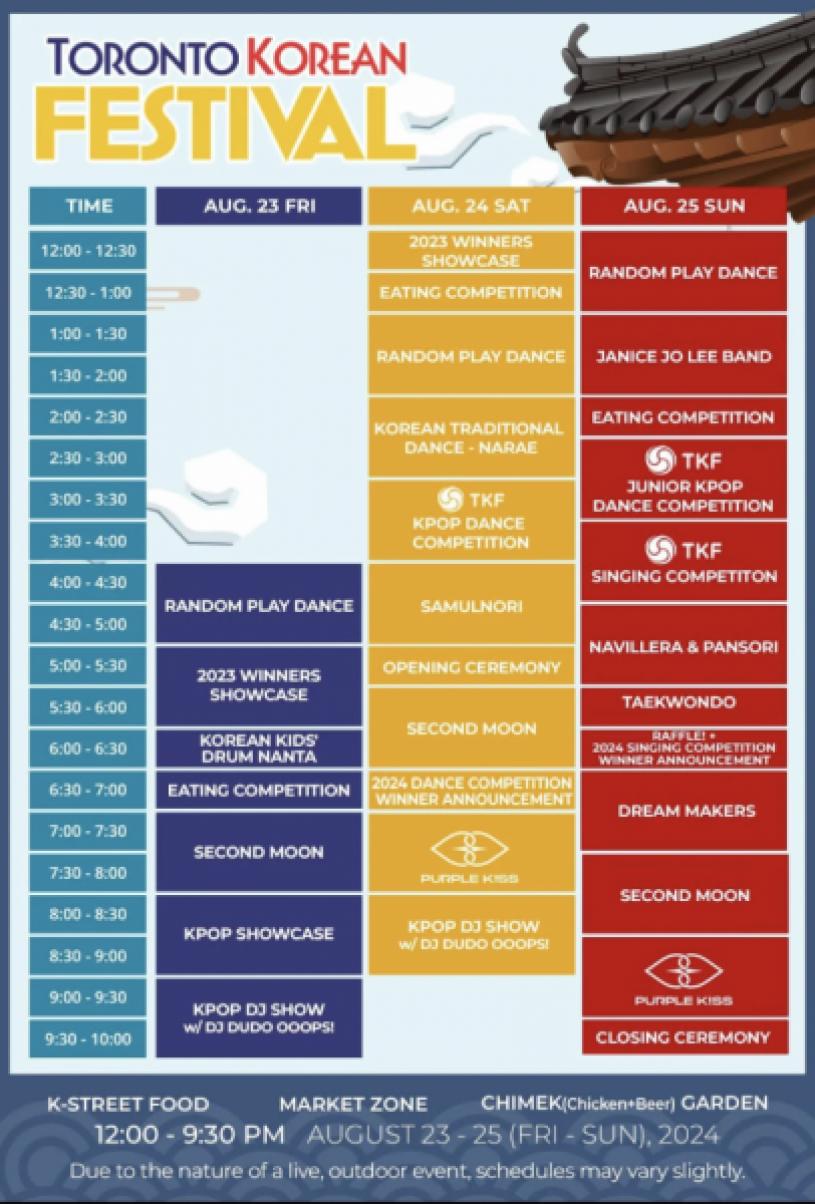 多伦多韩国节将于本周五(23日)开幕,一直持续到8月25日(周日)。每天都有独特的时间表,住在周围的朋友每天都可以过去凑热闹看表演吃美食!