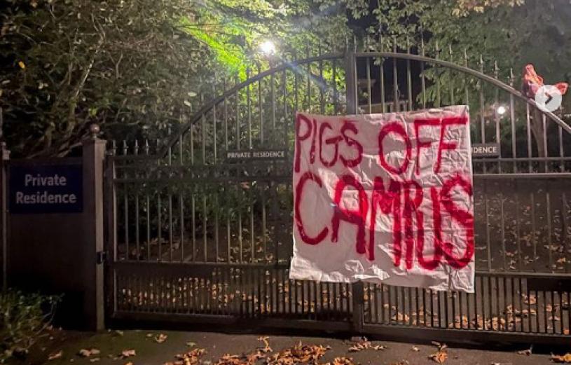 据Black Press Media报道,一个支持巴勒斯坦的学生团体在Instagram上发文,声称对这一行动负责,并分享了猪头以及挂在大门上横幅的照片,上面写着“猪离开校园”。