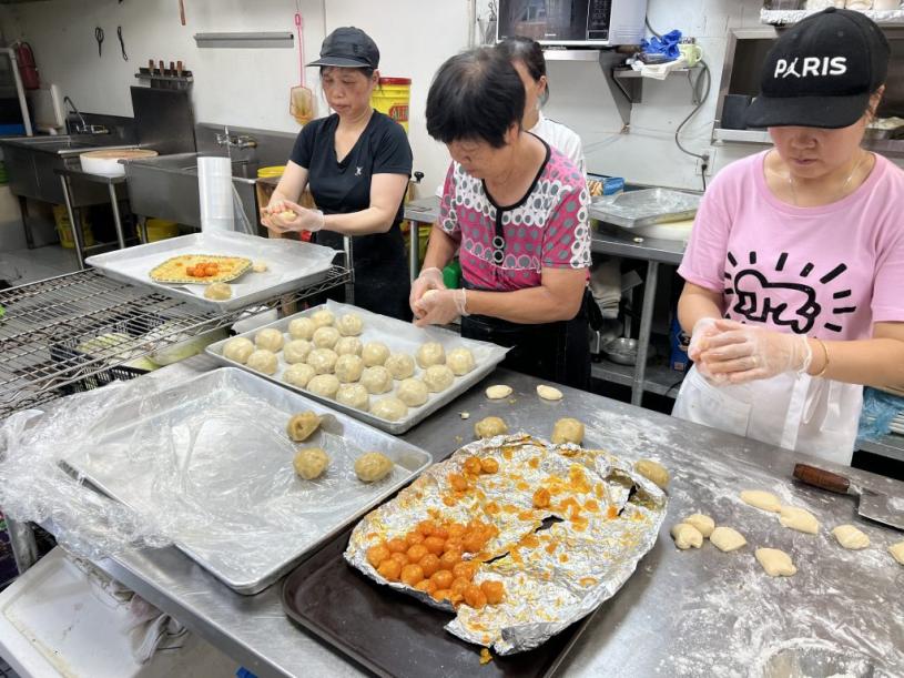 每年临近中秋节,月饼的需求量大增,一家店可能会卖上千盒的月饼。在制作月饼的过程中,往往需要一群人协力合作,才能完成整个生产流程。因此,乐哥把太太以及七十多岁的妈妈也拉进厨房一起帮忙。“月饼的制作不是用机器操作,而是纯靠手工,所以需要很多人一起做,制作时间可能长达五至六个小时。”