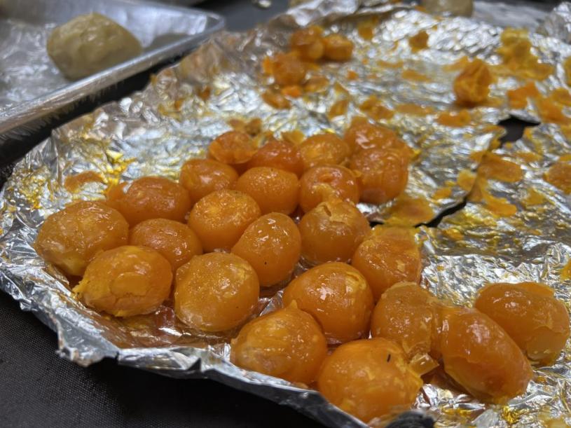 选用新鲜的咸蛋,去除蛋白部份,把蛋黄烘十五分钟左右至八成熟,颜色金黄而饱满,才能令月饼达到最佳风味。