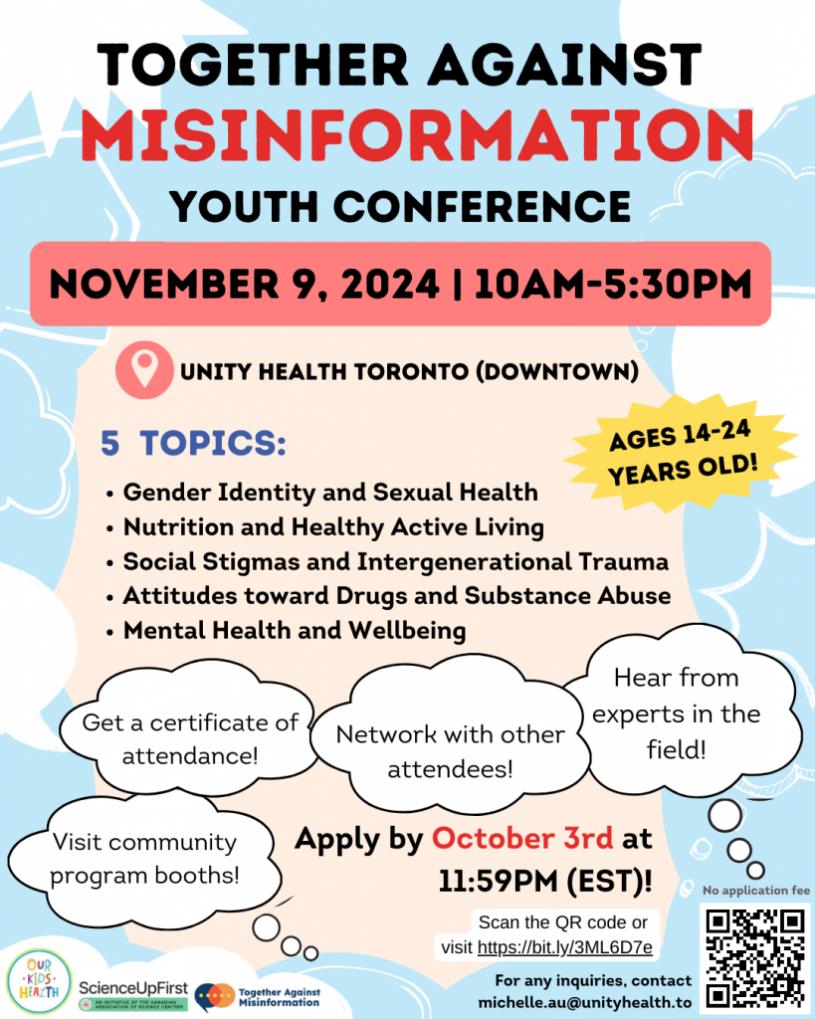 【社区消息】圣麦克医院“Our Kids’ Health”团队将于2024年11月9日,在多伦多市中心举办免费的“Together Against Misinformation (TAM) 青年交流会”,专注于提高14至24岁青年对正确健康资讯的认识。活动将涵盖性健康、营养、心理健康等关键话题,并为新移民青年提供与医疗保健界别的专业人士交流、结识同伴的机会。参与者将获得证书,还可享有15加元的交通补助。