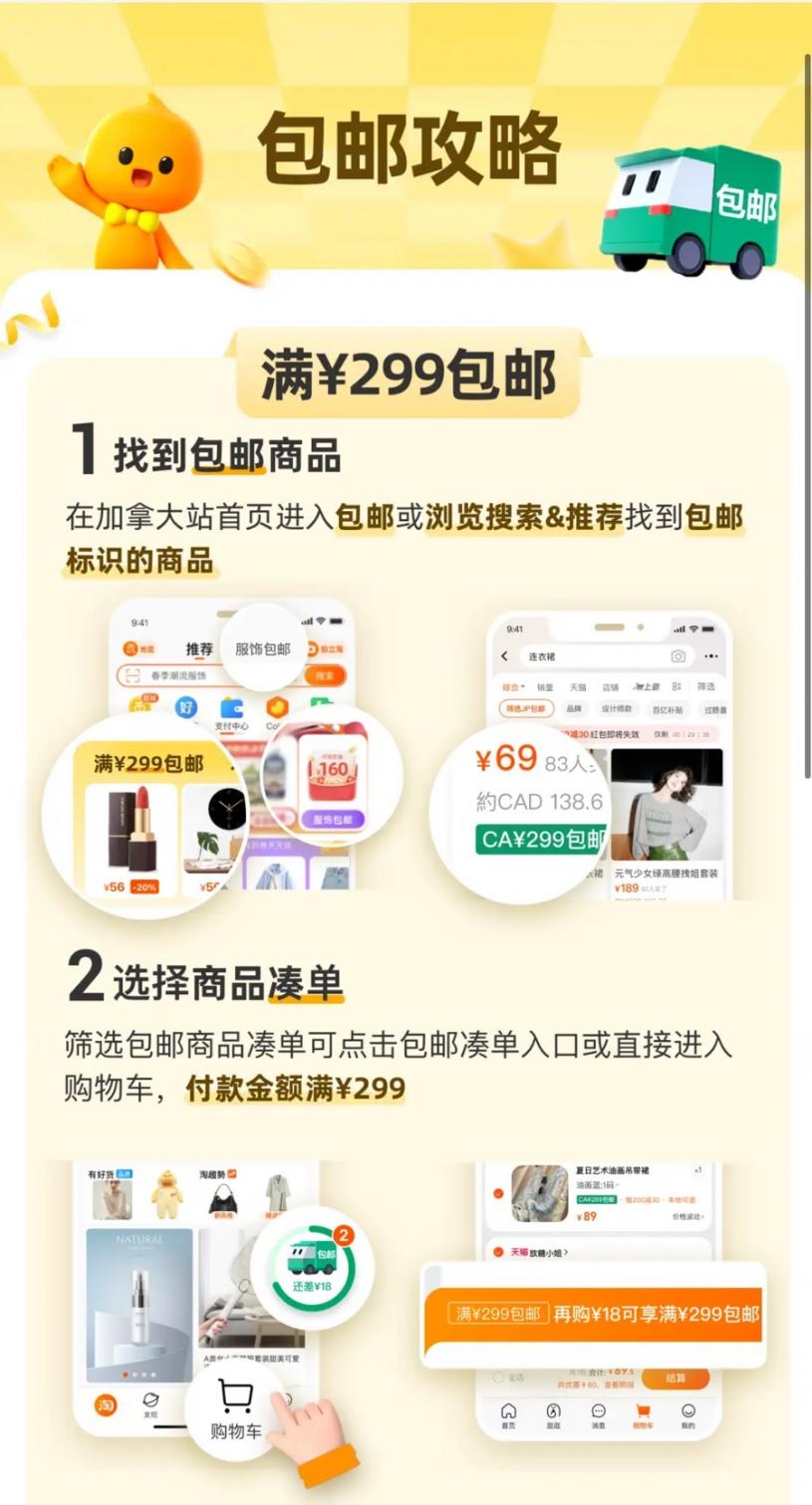 【星岛综合报道】近日,加拿大的华人网民们很激动!据悉,淘宝推出了满299人民币空运直邮加拿大的包邮活动,还可本地退货。部分店铺的服饰和生活用品等都参与活动。
