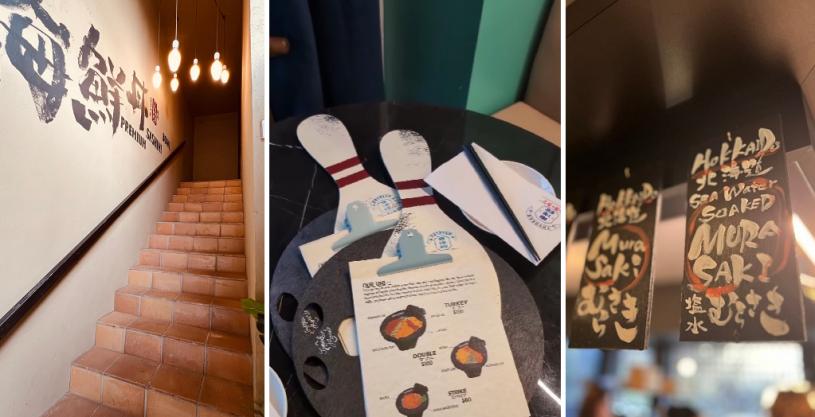 日式丼如何與保齡球拉上關係? 丼意謂碗,即英語的Bowl,與保齡(Bowling)同音,因此店主以保齡球為題設計了餐廳。店內除了有保齡球樽擺設品外,還有保齡球樽吊燈和以保齡球圖形設計的餐牌。