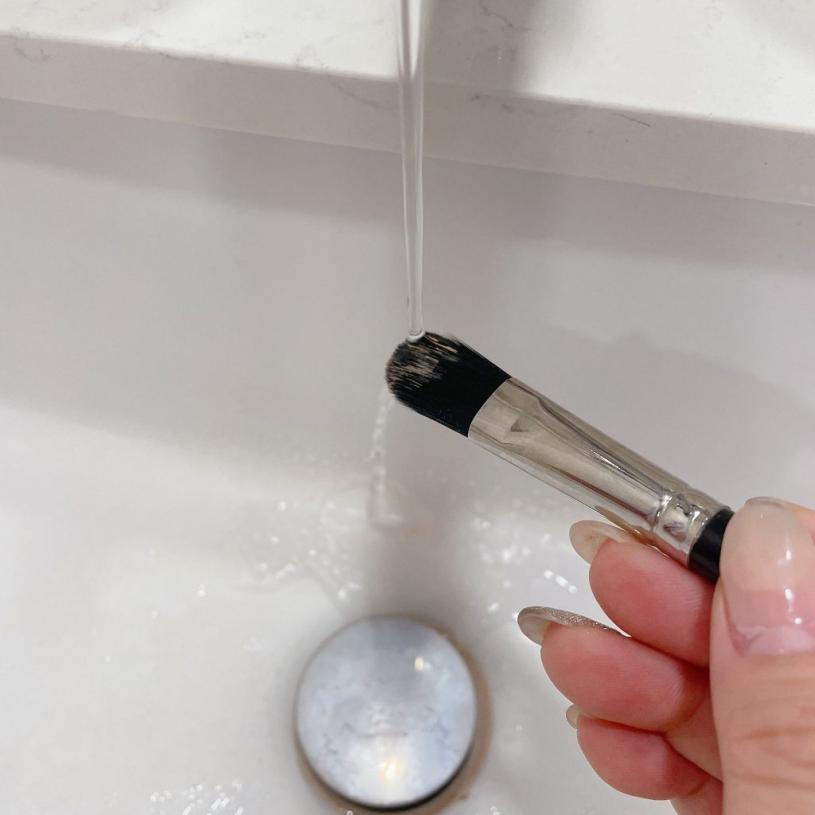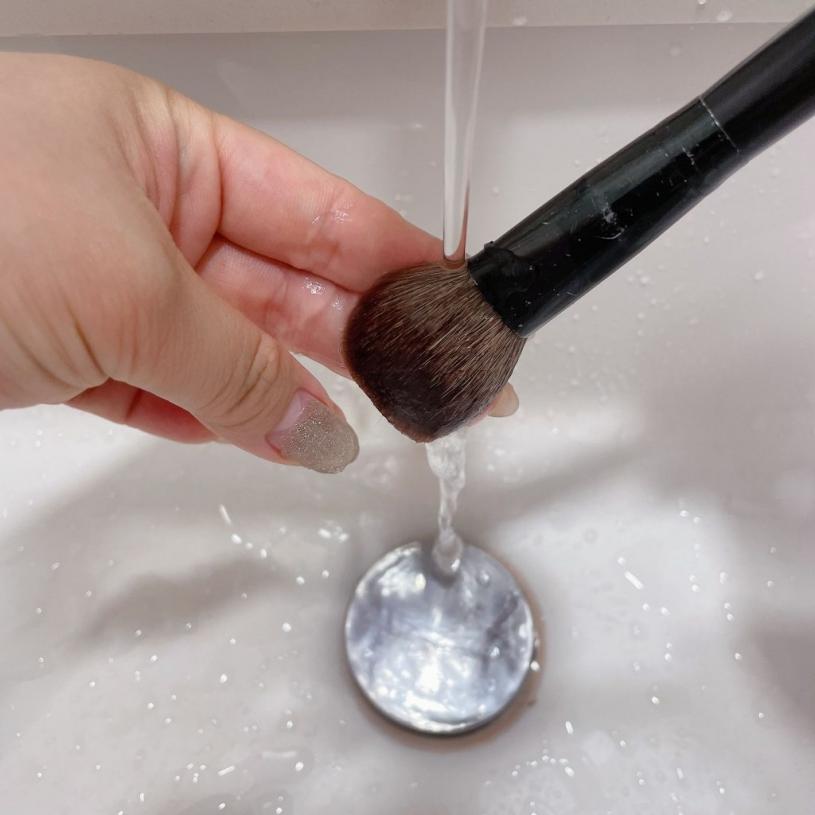 1. 将化妆刷的刷毛朝下,打开水龙头,用水冲湿刷毛;