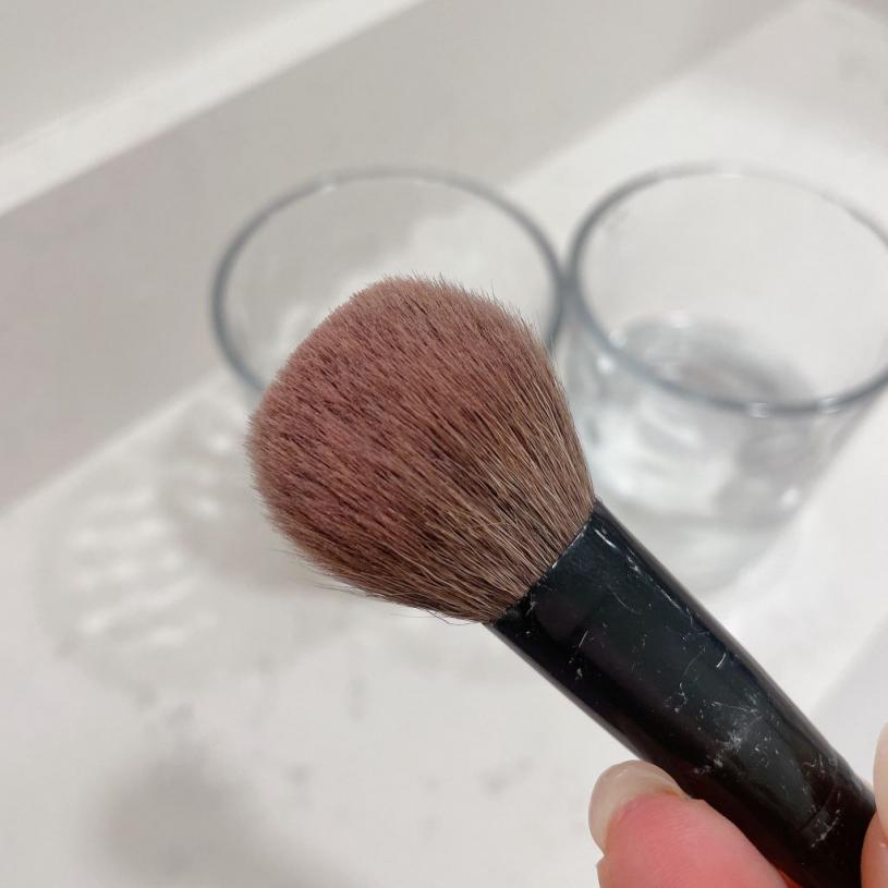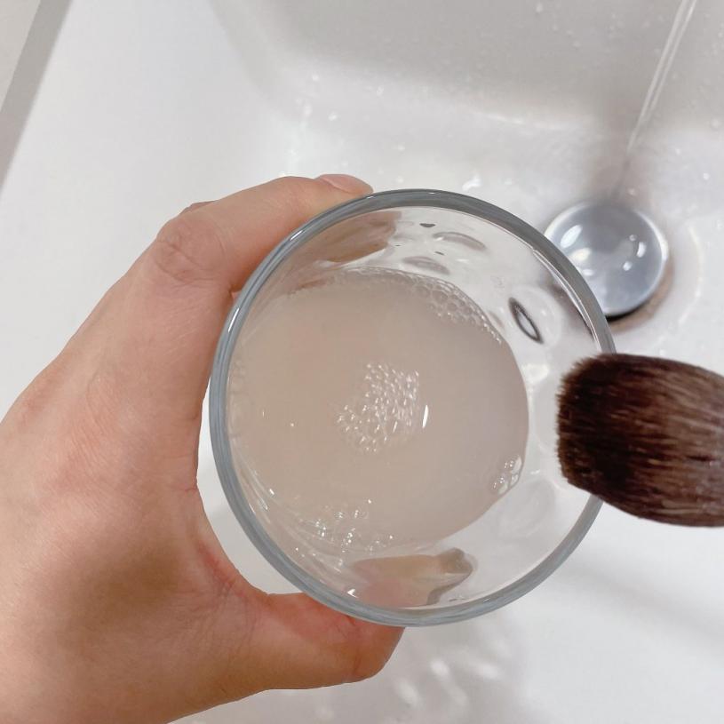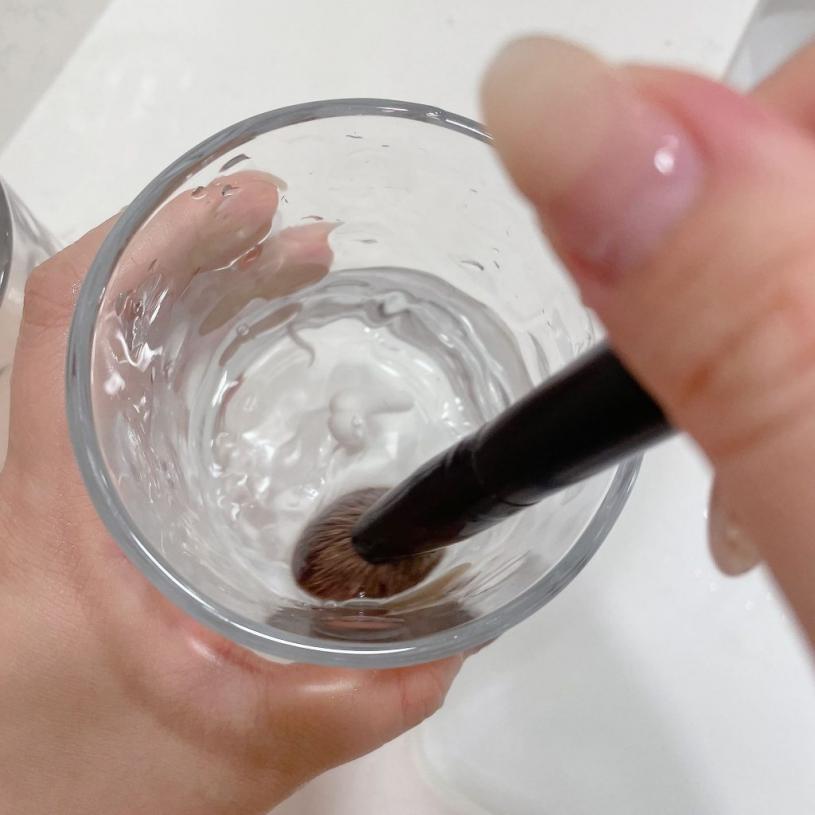 3. 将刷毛放入装有洗头水的杯子中,顺时针轻轻打圈,直到刷毛上的污垢被清除;