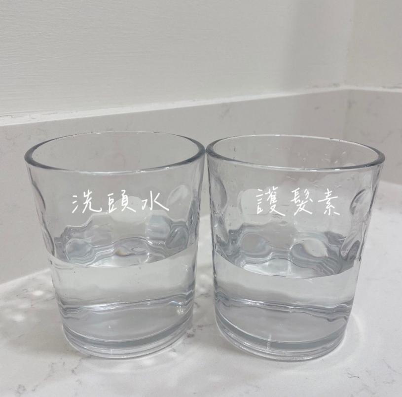 2. 准备两只干净的透明杯子:一杯装入洗头水,另一杯装入护发素;