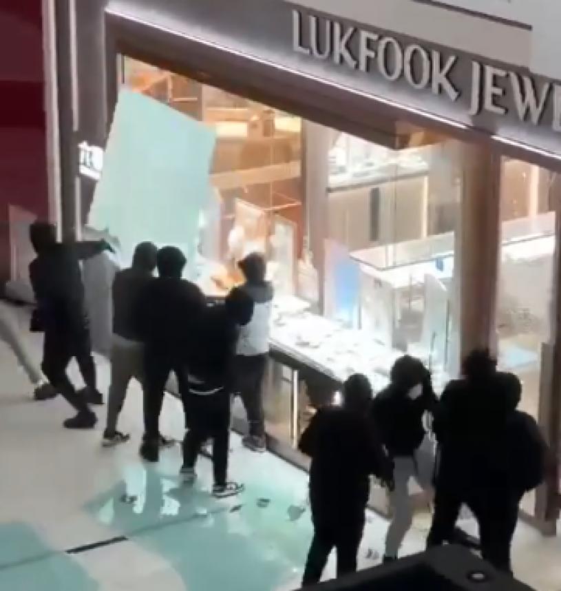 【星岛综合报道】万锦市Markville Mall六福珠宝今午(4日)又遭抢劫!打劫现场有不少市民目睹案发经过,有不少网民将拍得短片放上社交媒体,其中流传于IG及《小红书》的影片可见,六福珠宝遭至少10名蒙头群匪持锤及工具敲碎玻璃橱窗后,抢走珠宝展示柜的珠宝。约克区警方在中午时分表示,现时警方已拘捕6名疑犯,尚有几名疑犯在逃。