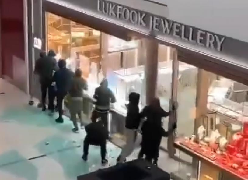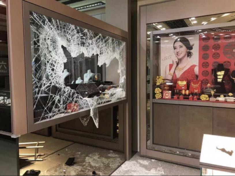 2018年12月30日,周日下午6:25分顾客正多的时候,六福珠宝店被最少4名身穿橙色条纹反光工作背心、戴着面罩的人,大肆掠夺珠宝店玻璃饰柜内的金饰。