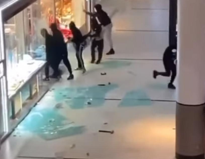 影片中大约有10名劫匪作案,有人用脚踢门,有些则用锤和其他工具击碎珠宝展示橱窗玻璃。