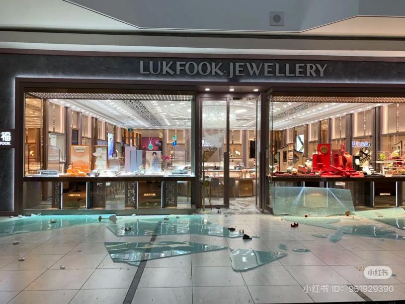 2024年04月26日,下午1时左右,三名嫌疑人持驱熊喷雾闯入六福珠宝店(上图)。警方表示,嫌疑人抢走了一批珠宝后,乘坐一辆偷来的车逃走。包括在车上等候的一名嫌疑人在内,共有4名嫌犯。