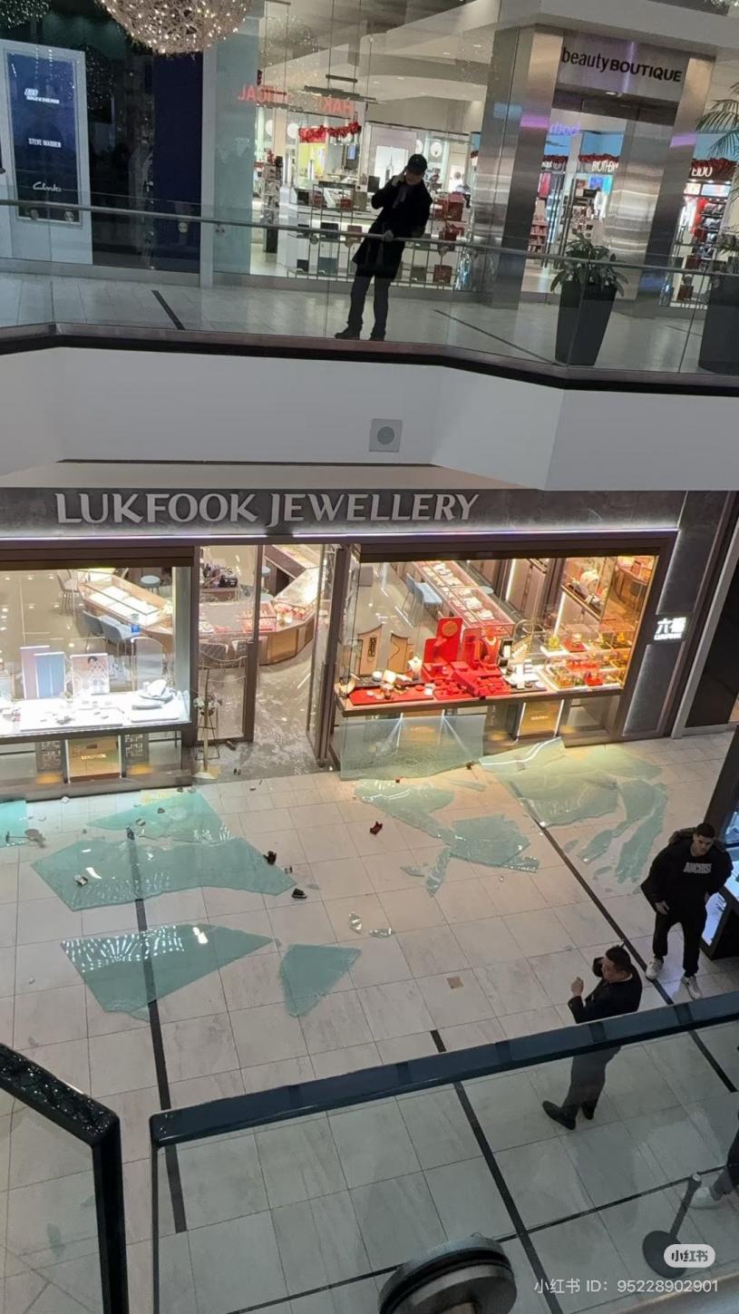 现场玻璃橱窗粉碎散落一地,有匪徒用力踢珠宝店大门,大门最后被劫匪踢开,有3到4名劫匪进入抢掠。暂时未有损失报告。