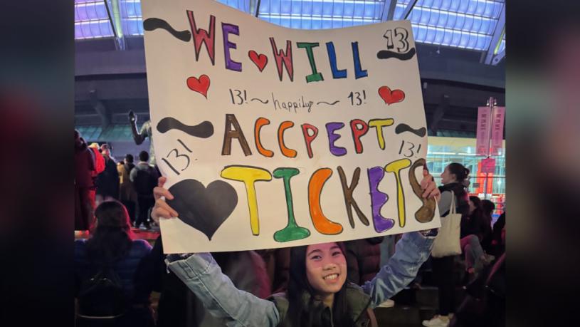 【星岛综合报道】13 岁的华裔少女哈新妮 (Sidney Ha,音译) 是众多没有泰勒丝温哥华 Eras 演唱会门票的粉丝之一,她和这群人都聚集在卑诗体育馆的围栏外举著牌子渴求有人赠送或转售门票,竟没想到真遇上一位陌生人慷慨相助,哈新妮最终进入了体育馆聆听偶像唱歌。