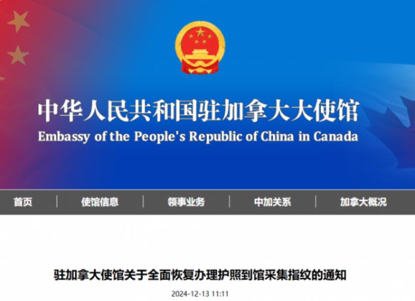 【星岛综合报道】中国驻加拿大使馆12月13日发布关于全面恢复办理护照到馆采集指纹的通知。全文如下: