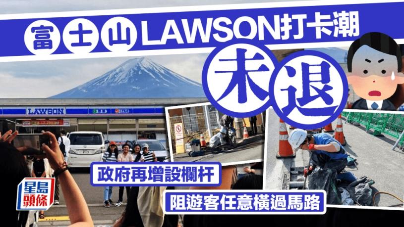 日本山梨縣富士河口湖町公所為解決「觀光公害」問題,早前在LAWSON便利店外架設黑布幕阻擋遊人拍攝富士山,現在再度出招,周一在便利店同側行人路上安裝新欄杆,盼能阻止遊客任意橫越馬路。