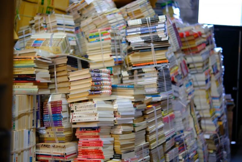 其中一个仓库后方,竖立了几座“小书山”,记者目测总计有约五、六千本书。图为其中一座“小书山”。(何逸蓓摄)