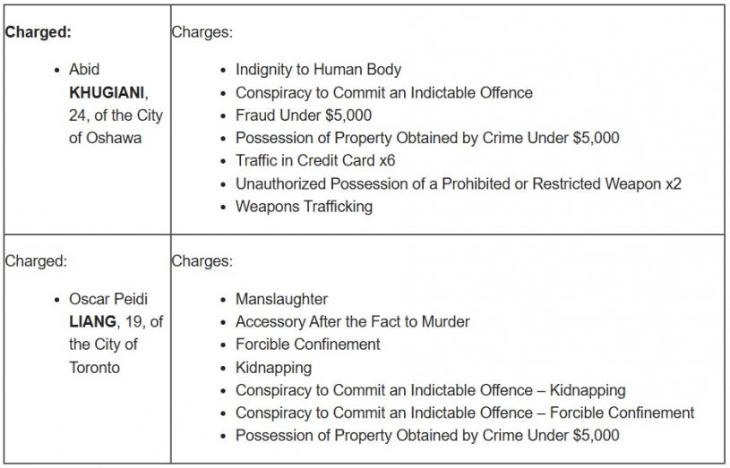 两名疑犯分别是24岁的Abid Khugiani及19岁的华裔男子 Oscar Peidi Liang,两人都是奥沙瓦居民。两名疑犯分别于11月27日及12月4日被捕。