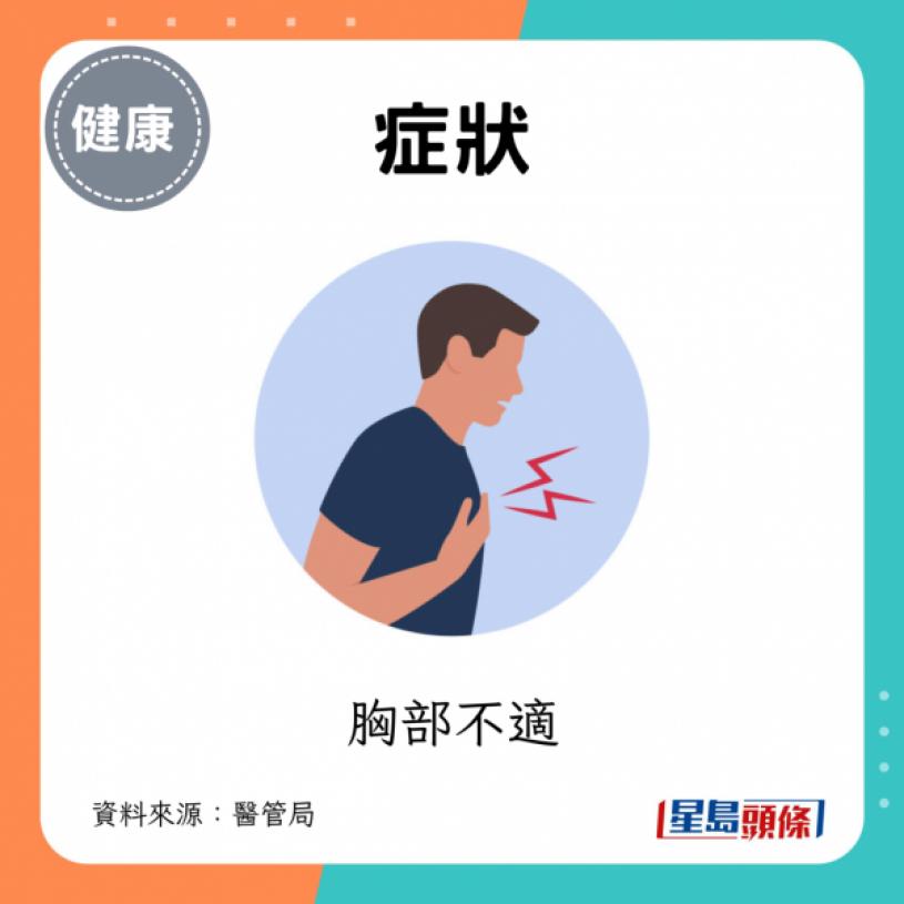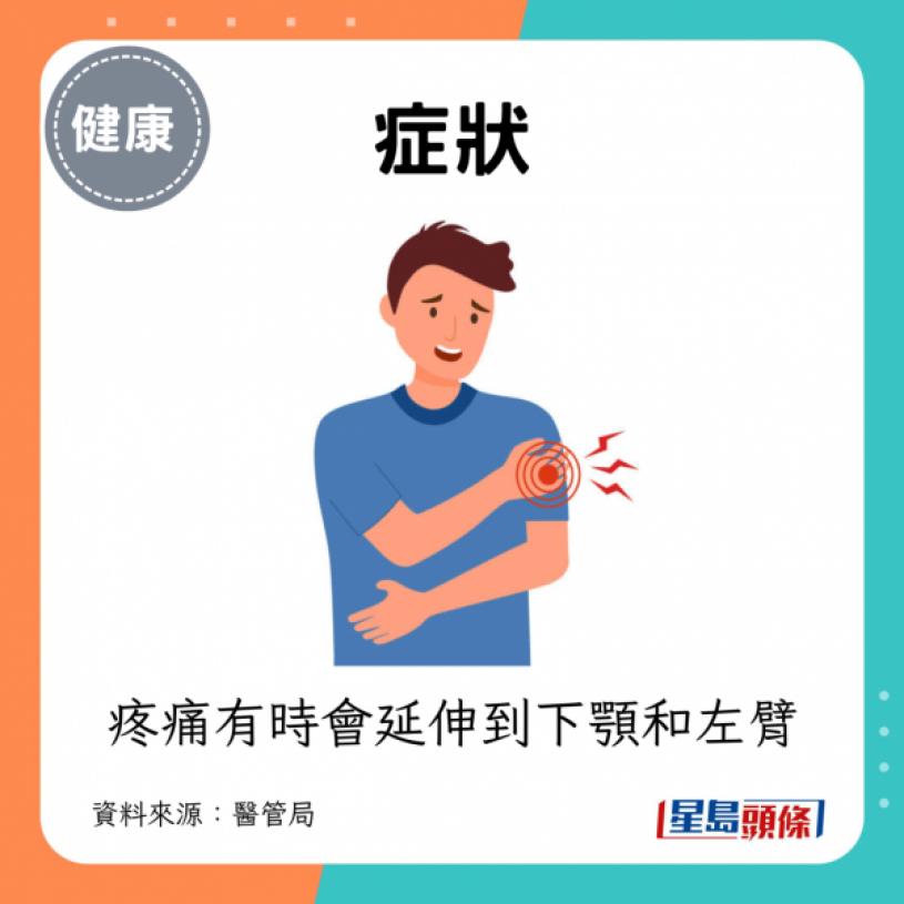 - 典型症狀:心口痛和胸部不適,有時更會延伸到下顎和左臂,冒汗和呼吸困難。
