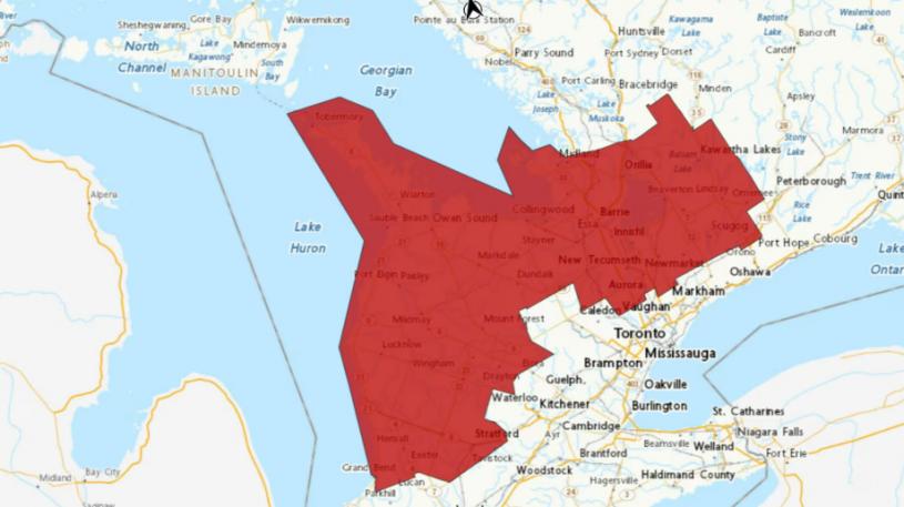 環境部指出,Lake Huron及Georgian Bay附近地區大雪影響視野,湖泊效應降雪將於早上逐漸南移及減弱。Lake Huron沿岸地區的大雪預計於周日晚結束,該區的風速高達時速60公里,吹西風。