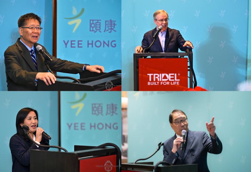 (左上)颐康基金会创办人兼主席王裕佳医生、(右上)Tridel集团首席行政总监Jim Ritchie、(左下)香港驻多伦多经济贸易办事处处长巫菀菁 (Emily Mo)及颐康基金会总裁萧显扬在启动仪式上发言。