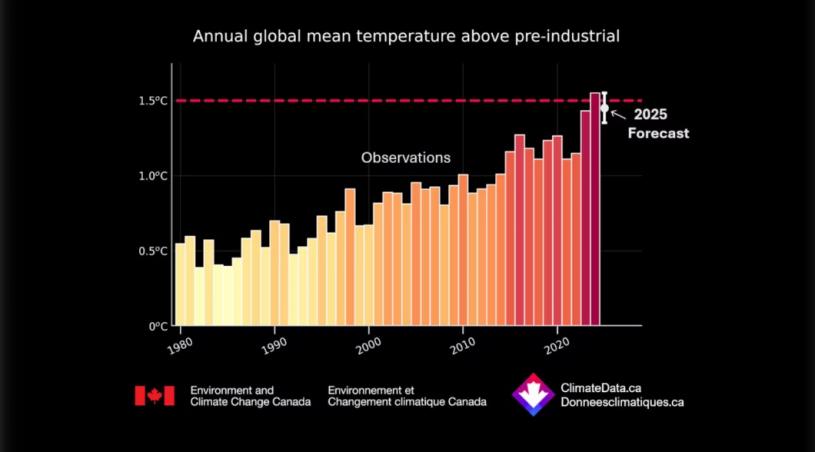 加拿大氣象部門預測,2025 年的氣溫僅會比 2024 年低,但會比歷史上其他年份都高。2024 年是首次超過工業化前水準 1.5 攝氏度。