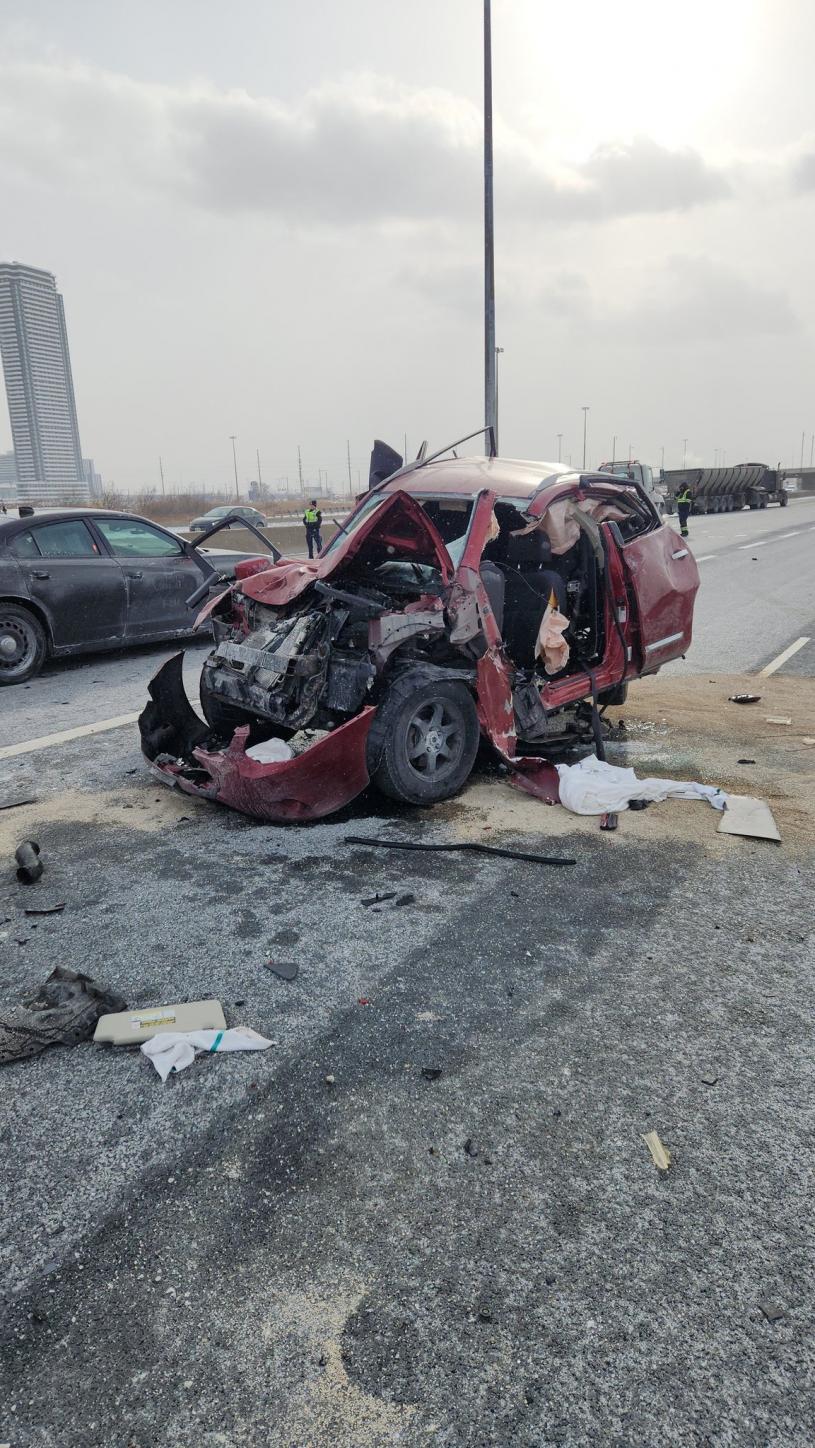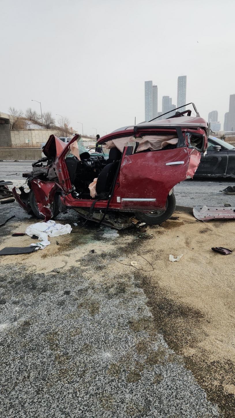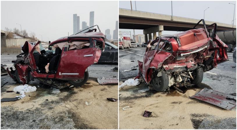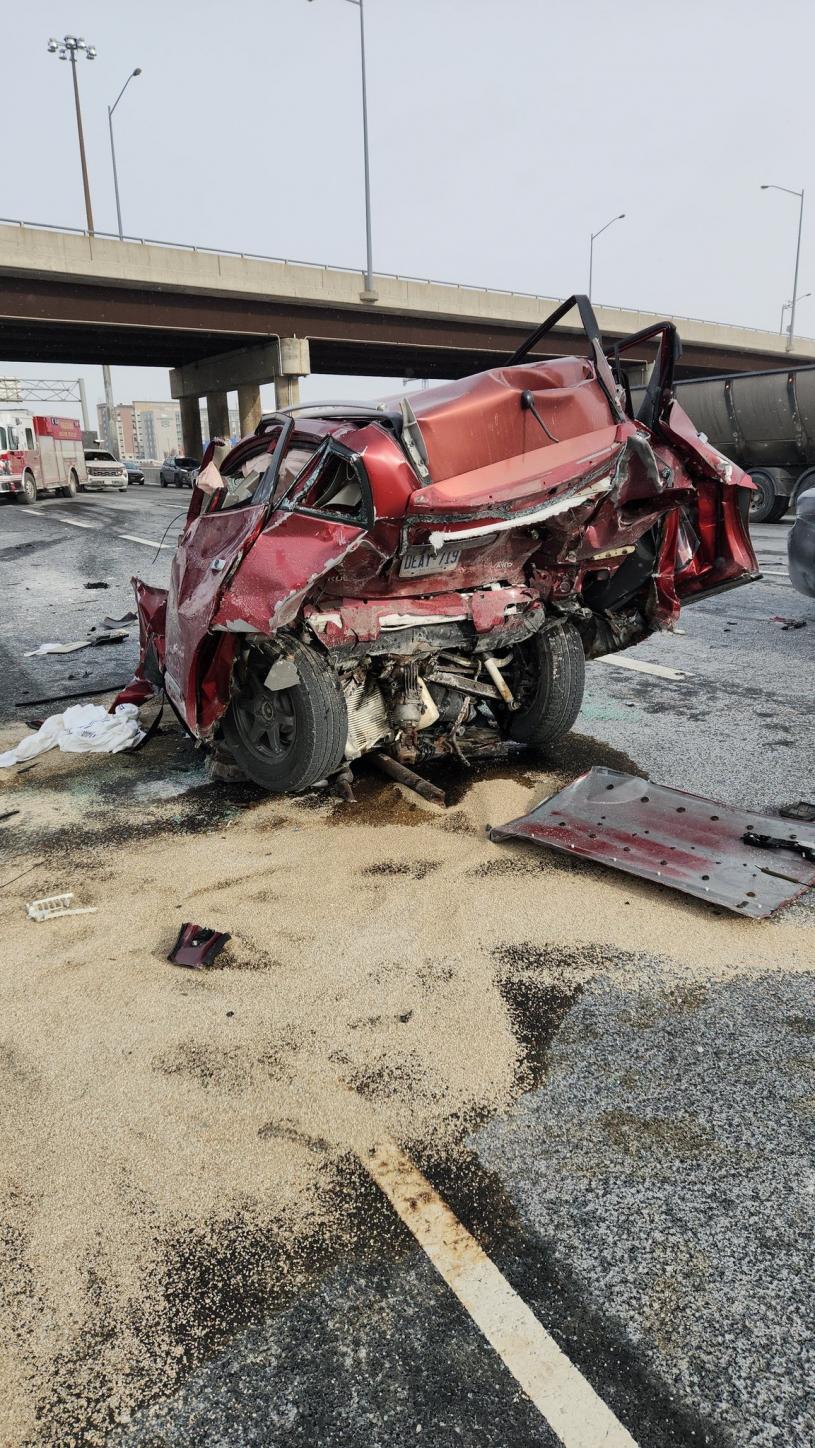 案发于400高速公路南行线,当时一辆汽车被拖车追撞。随后,被撞车辆撞上一辆运送盐的货车。
