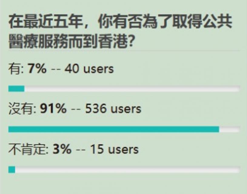 一、讀者十居其九(91%)都表示,最近五年內沒有為取得公共醫療服務而到香港;只有 7%表示有。