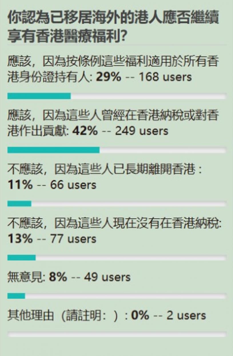 有近四分一(24%)讀者則認為,海外港人不應該享有香港醫療福利;當中有 54%(佔整體受訪者13%)表示,原因是這些人現已沒有在香港交稅;其餘 46%(佔整體受訪者11%)表示,因為這些人已長期離港。