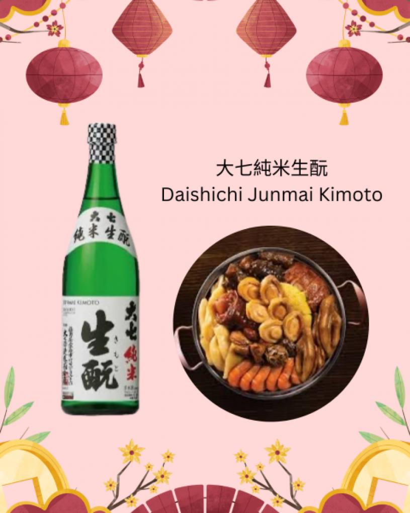 到晚饭的时间很多家庭也喜欢吃盆菜,盆菜包含不同的食材,重鲜味(umami) 的例如冬菇,瑶柱和腩肉等加上汁料的味道,建议配搭生废(Yamahai)或生酛(Kimoto) 的清酒,大七纯米生酛(Daishichi Junmai Kimoto)口感厚重,含突出的乳酸味道,和酱汁中的蠔油和豉油非常合拍,更可以带出鲜味。