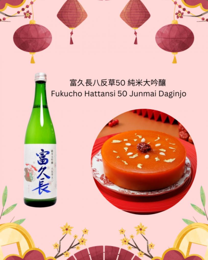 大家也可能会吃甜甜的椰汁或蔗糖年榚。不妨用一支甜度较高,花香果香较重的纯米大吟酿去衬托年榚的蔗糖清香。 富久长八反草50 纯米大吟酿 (Fukucho Hattansi 50 Junmai Daginjo) 有黄苹果、哈密瓜的香气,而此酒清甜的味道和蔗糖的口味亦互相辉映。