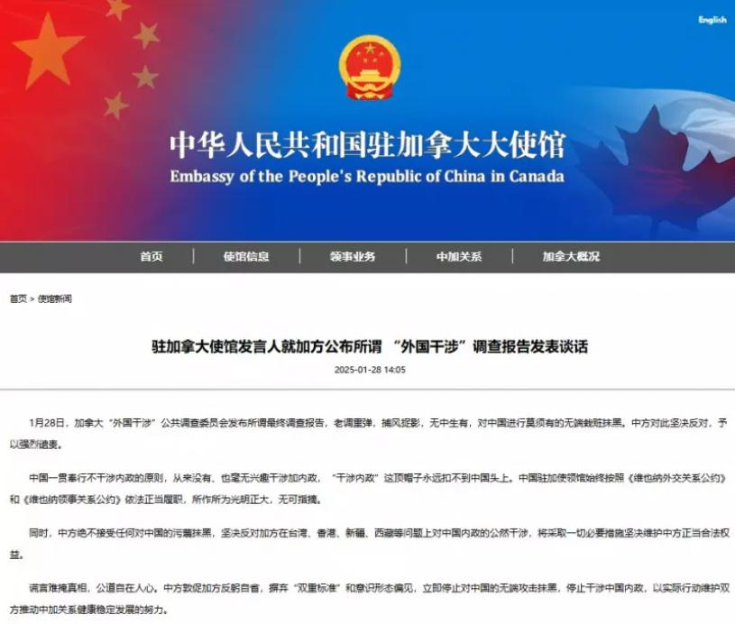 【外國干預最終報告】中國駐加大使館回應:堅決反對 強烈譴責