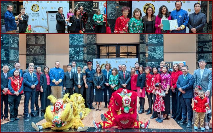 【社区消息】密西沙加华商会于 1 月 29 日农历年初一在密市市府大堂举行新春团拜,近二百名市民、政商界要领及嘉宾欢聚一堂,庆祝蛇年的来临。