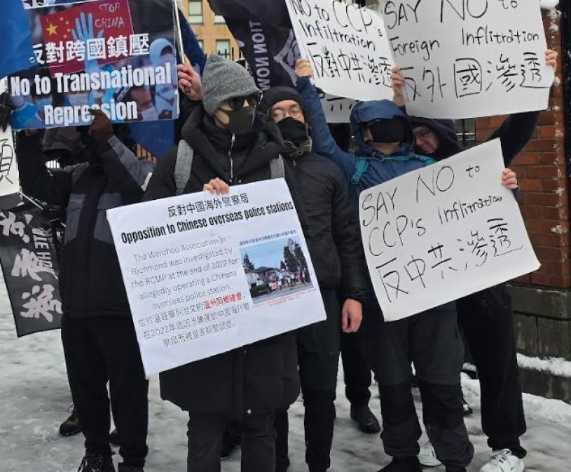 只不过对于有些无法和家人团聚的香港民主倡议者来说,心里特别难过。一群香港人在华埠游行活动现场举著“反外国渗透”“反跨国镇压”的标语和旗帜,警示民众外国干预的问题。