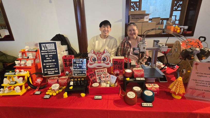 摊位摆设有卖包子、水饺等应景食品,还有用3D打印的窗花、灯笼、过年小饰品等,处处都有惊喜。