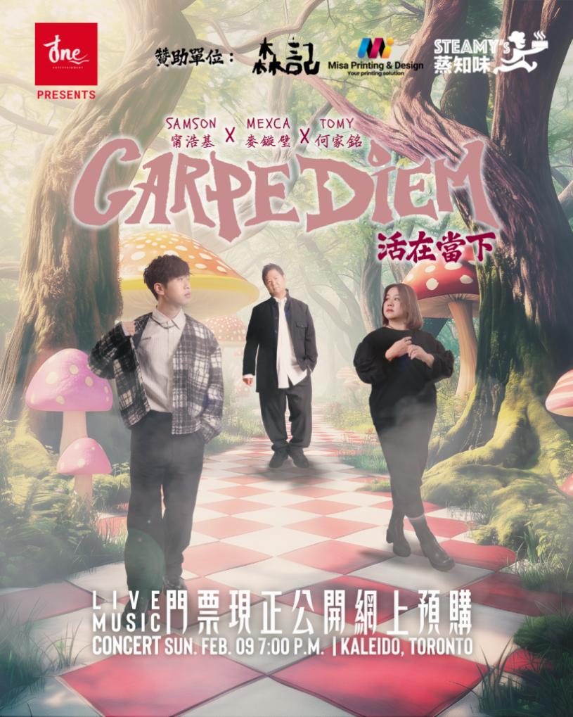 【演唱会快讯】由 Mexca Mak(麦镟璧)、Samson Ling(宁浩基)、Tomy Ho(何家铭)主演的《CARPE DIEM 活在当下》演唱会将于 2025 年 2 月 9 日在烈治文山Kaleido 举行。演出以音乐呈现人生六个阶段,融合不同音乐风格,探讨生命历程与成长体验。