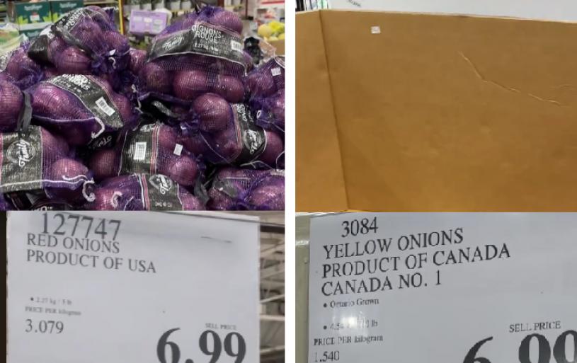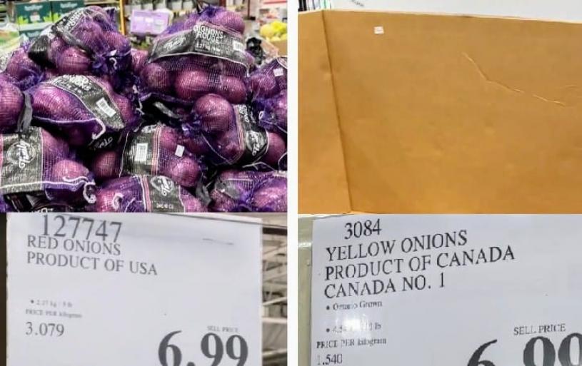 安省一家Costco 的货架上,周一 (3日) 标示为加拿大出产的洋葱被抢购一空,货箱空空如也;反之旁边的美国洋葱同样以6.99元发售,却堆积如山无人问津,可谓同葱不同命。