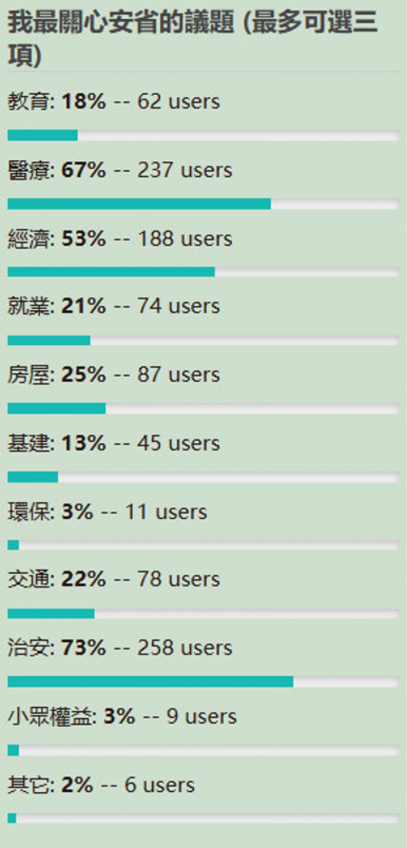 问卷这题最多可选三项。读者最关心的三个议题都与民生攸关,依次为治安( 73%)、医疗( 67%)和经济(53%),当中治安成为了重中之中的头号大事,近四分三读者表示关切。
