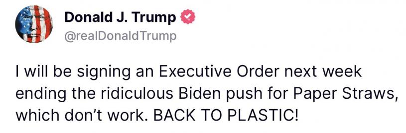 特朗普文中指,“我将于下周签署一项行政命令,结束拜登推行的荒谬的纸饮管政策,因为纸饮管根本不起作用。回归塑料!”