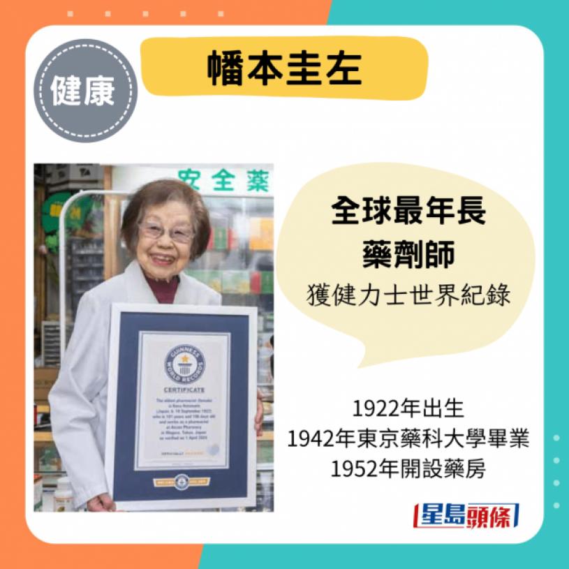 現年102歲幡本圭左(はたもと けさ)生於1922年,1942年畢業於東京藥科大學。結婚後,她於在1952年開設藥房。現時雖已過100歲,但她仍精力充沛,一星期工作六天。2022年,她被健力士世界紀錄(Guinness World Record)認定為全球最年長的女藥劑師(the oldest pharmacist (female)),當年她仍親自管理庫存、訂貨、送貨的工作。
