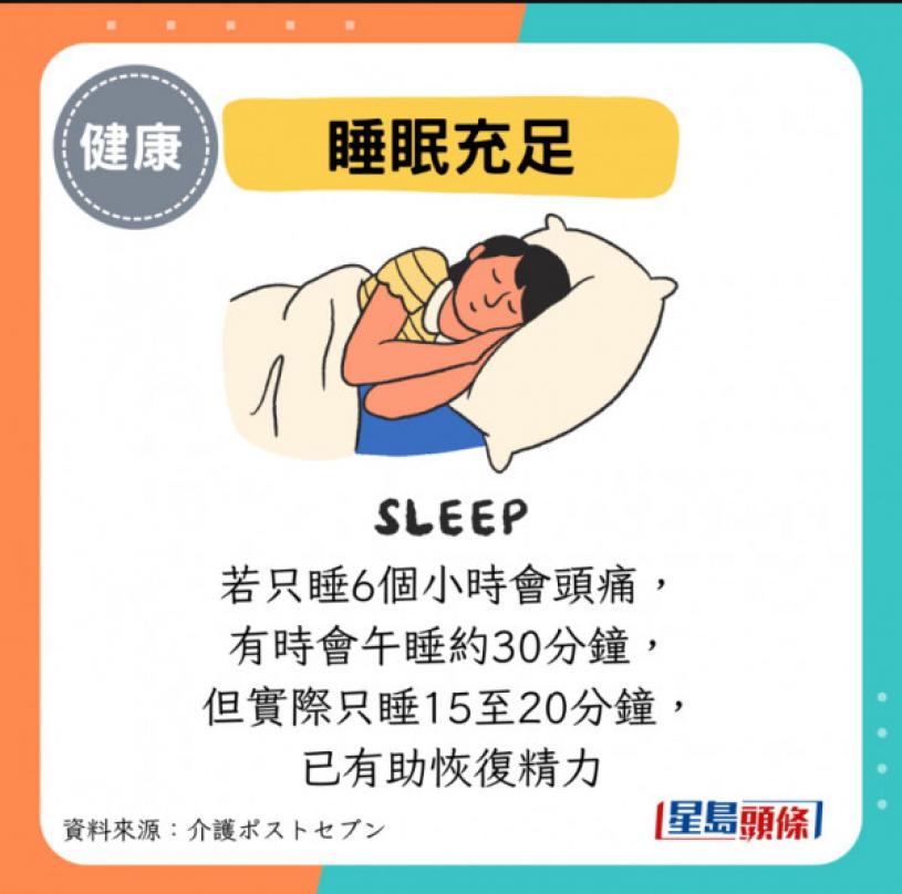 幡本圭左每天早上7點起床,晚上11點半睡覺,保持每天有7.5小時的睡眠時間,有助腦細胞正常運作。她表示,若只睡6個小時會頭痛。因此,有時她會躺在梳化午睡約30分鐘,但實際只睡15至20分鐘,已有助恢復精力。