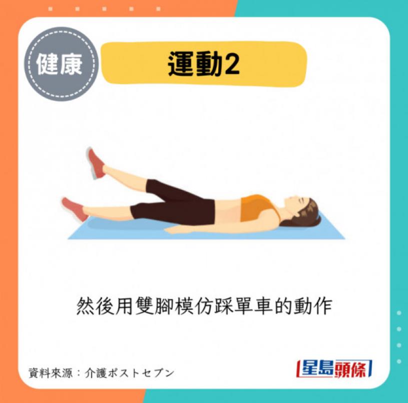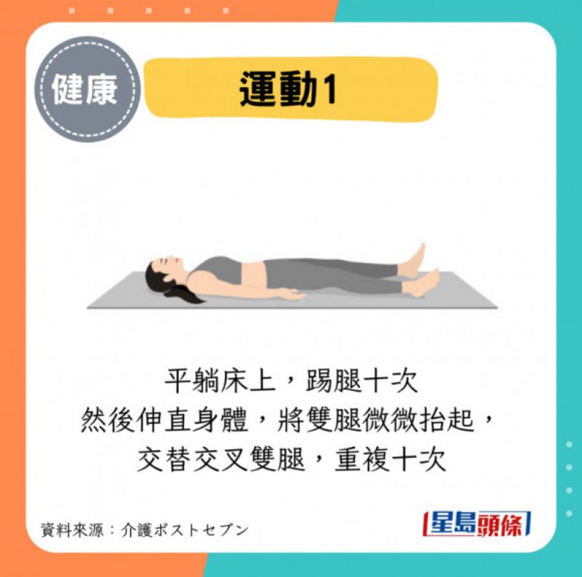 - 平躺床上,踢腿十次;然後,身體伸直,將雙腿微微抬起,交替交叉雙腿,重複十次。