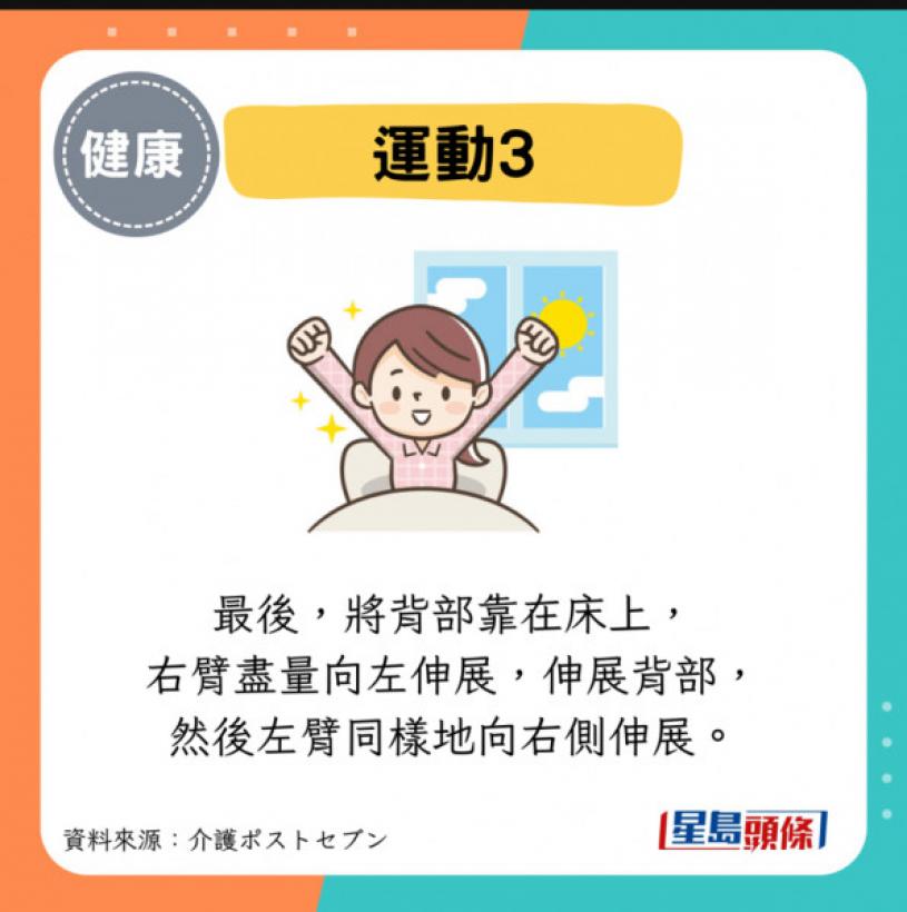 - 最後,將背部靠在床上,右臂盡量向左伸展,伸展背部,然後左臂同樣地向右側伸展。