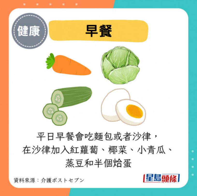 幡本圭左平日早餐,她通常會吃麵包或者沙律,最喜歡在沙律加入紅蘿蔔、椰菜、小青瓜、自製蒸豆和半個烚蛋。