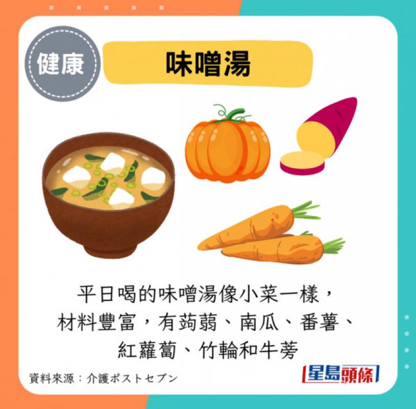 除了以上食物,她笑言,平日喝的味噌湯就像小菜一樣,材料豐富,有蒟蒻、南瓜、番薯、紅蘿蔔、竹輪和牛蒡。